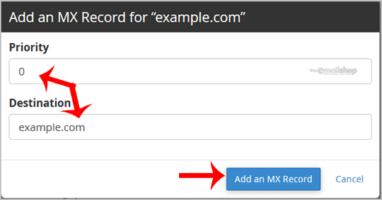 3. Click on the "MX Record" and a small window will open. Enter the required details in it.