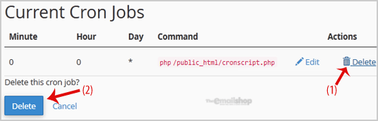1. Under "Current Cron Jobs", locate your cronjob and then click on "Delete" button