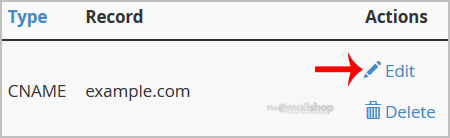 4. Locate CNAME Record you wish to edit or remove. Should you wish to edit a CNAME record, click the "Edit" option, modify the details and then click on "Save Record". Removing a record can be done with the "Delete" option.