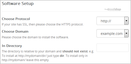 - In Directory: If you want to install this in a directory, for example example.com/directory, enter the directory name. Otherwise, leave this blank to install in your main domain example.com
