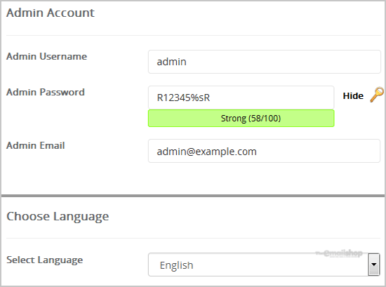 • Admin Username: Your new Concrete5 username (for security reason do not use the "Administrator" or the "Admin" username.)