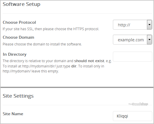 • In Directory: If you want to install this in a directory, for example example.com/directory, enter the directory name. Otherwise, leave this blank to install in your main domain example.com