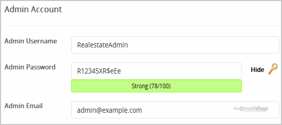 - Admin Username: Your new Open Real Estate username (for security reason do not use the "Administrator" or the "Admin" username.)