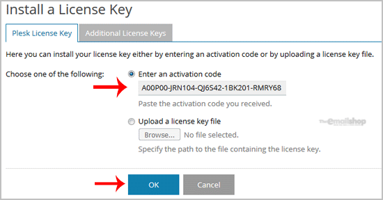 Step 7: Now click on "Install Key", enter your Plesk Activation code and press ok to save it. You can also use a trial key or use your own key.