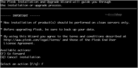 Step 4: Press "F" again. The installation will begin, which can take as long as 20 to 30 minutes. If it shows a hostname-related error, do not quit the installation. Sometimes Plesk only shows warnings and provides you with an instruction of how to fix your problem.