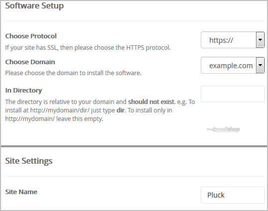 • In Directory: If you want to install this in a directory, for example example.com/directory, enter the directory name. Otherwise, leave this blank to install in your main domain example.com
