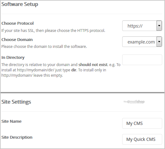 • In Directory: If you want to install this in a directory, for example example.com/directory, enter the directory name. Otherwise, leave this blank to install in your main domain example.com