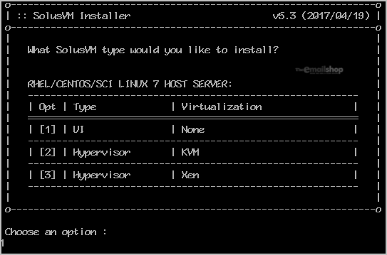 Then, it will display an option, allowing you to choose virtualization. Since we are going to install SolusVM Master, we will choose Option 1.