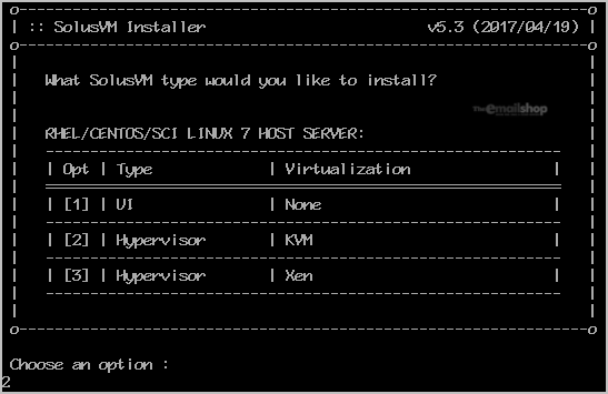 Then it will show you an option to choose virtualization. Most people prefer KVM and others Xen. Select your preferred virtualization by typing 1 or 2 and then press Enter. For KVM, we enter 2 and then hit Enter.
