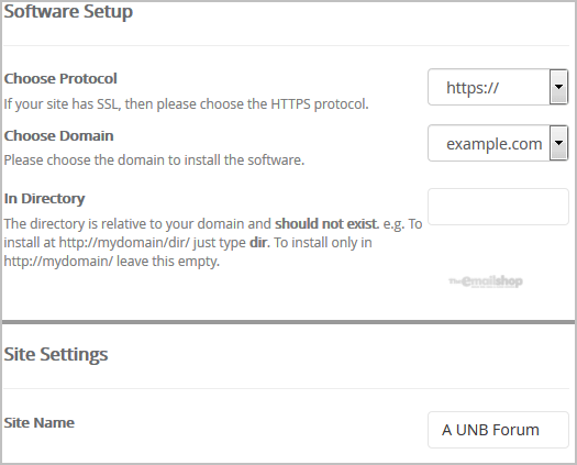 - In Directory: If you want to install this in a directory, for example example.com/forum, enter the directory name. Otherwise, leave this blank to install in your main domain example.com