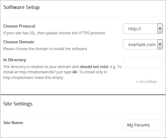 • In Directory: If you want to install this in a directory, for example example.com/forum, enter the directory name. Otherwise, leave this blank to install in your main domain example.com