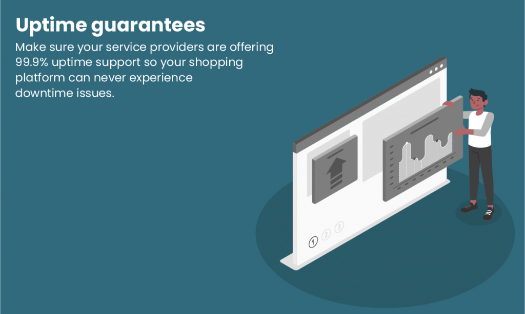 - Uptime guarantees- make sure your service providers are offering 99.9% uptime support so your shopping platform can never experience downtime issues.