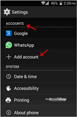 1. Open your android mobile, go to the main menu and the “Settings” options, and under the “Accounts” option, tap on “+ Add Account“.